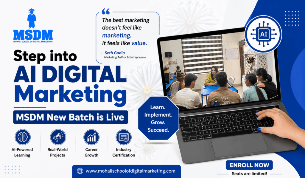 If you’ve been considering a career that is future-ready, high-income, and flexible, this is the perfect time to act. The new batch at MSDM (Mohali School of Digital Marketing) offers a powerful opportunity to step into AI-driven digital marketing with a hands-on, practical approach. Whether you are a student, professional, entrepreneur, or freelancer, this program is built to equip you with real-world skills that deliver measurable results.